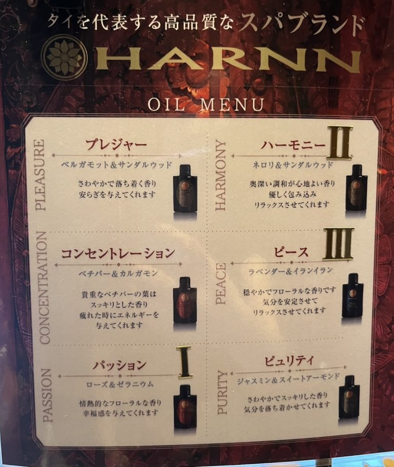 タイの高級スパブランド“HARNN”の精油を取り入れたオイルを使用しています。